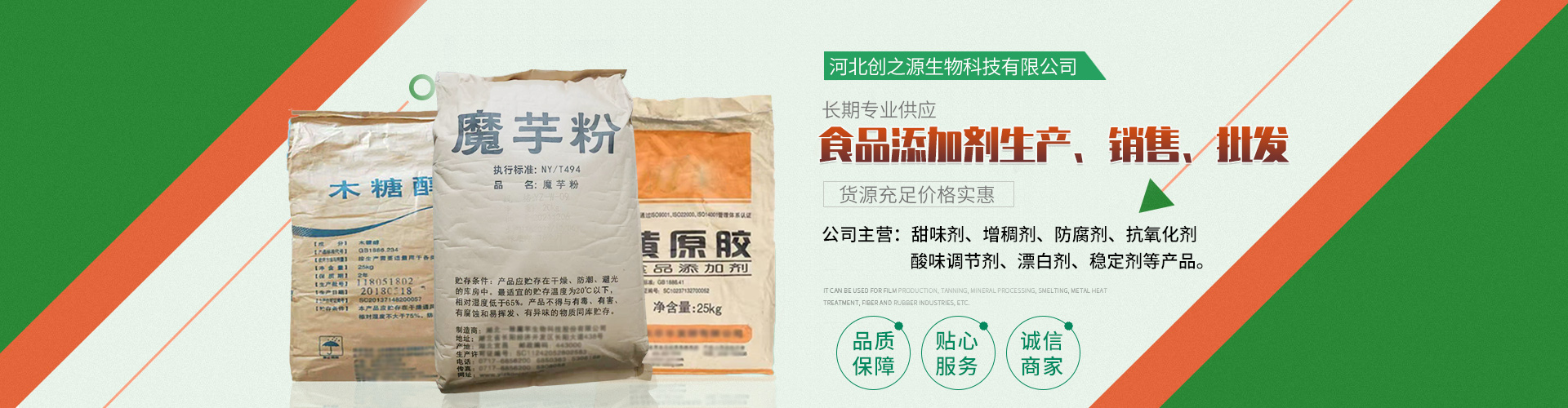 主要经营河北创之源生物科技有限公司是一家从事食品添加剂,生产、销售、与批发的企业,公司主要销售,海藻酸钠、黄原胶、卡拉胶、瓜尔胶、沙蒿胶、维生素C、维生素B、木糖醇、胍基乙酸、精氨酸、半胱氨酸、酪氨酸、甜味剂、增稠剂、防腐剂、抗氧化剂、酸味调节剂、漂白剂、稳定剂、食用色素、营养强化剂、乳化剂,抗结剂、酶制剂、维生素无机盐类等绿色环保型产品。。